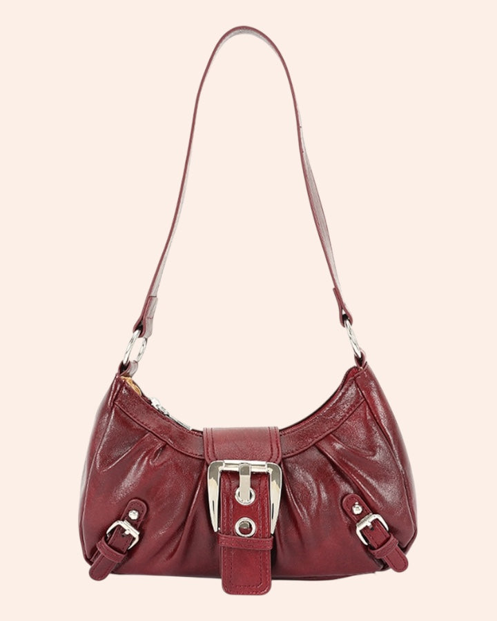 A chic burgundy shoulder bag with silver buckle details and a soft, 90’s-inspired shape. Simple, stylish, and just the right size for your everyday essentials.