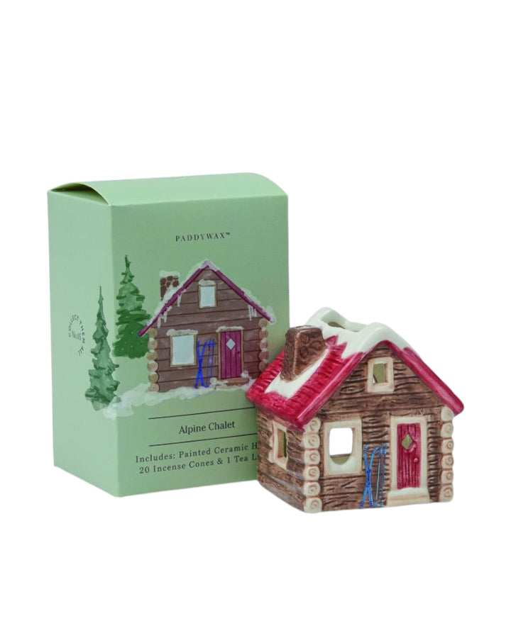 Number 05 of a Collectible Series | The Alpine Chalet Incense House & Tea Light Holder captures the rustic charm of a mountainside cabin. Artisanally designed, illustrated artwork is hand-painted onto ceramic to resemble an Alpine Chalet during ski season. It is intended to accommodate either an incense cone or tea light, making it a versatile and functional decor piece. Each house is intentionally crafted for incense smoke to smolder through the chimney, and for candlelight to flicker through the windows, perfect for creating a warm and inviting atmosphere. Fragrance: Palo Santo Includes 1 Tea Light & 20 Incense Cones Packaged in a Printed Box