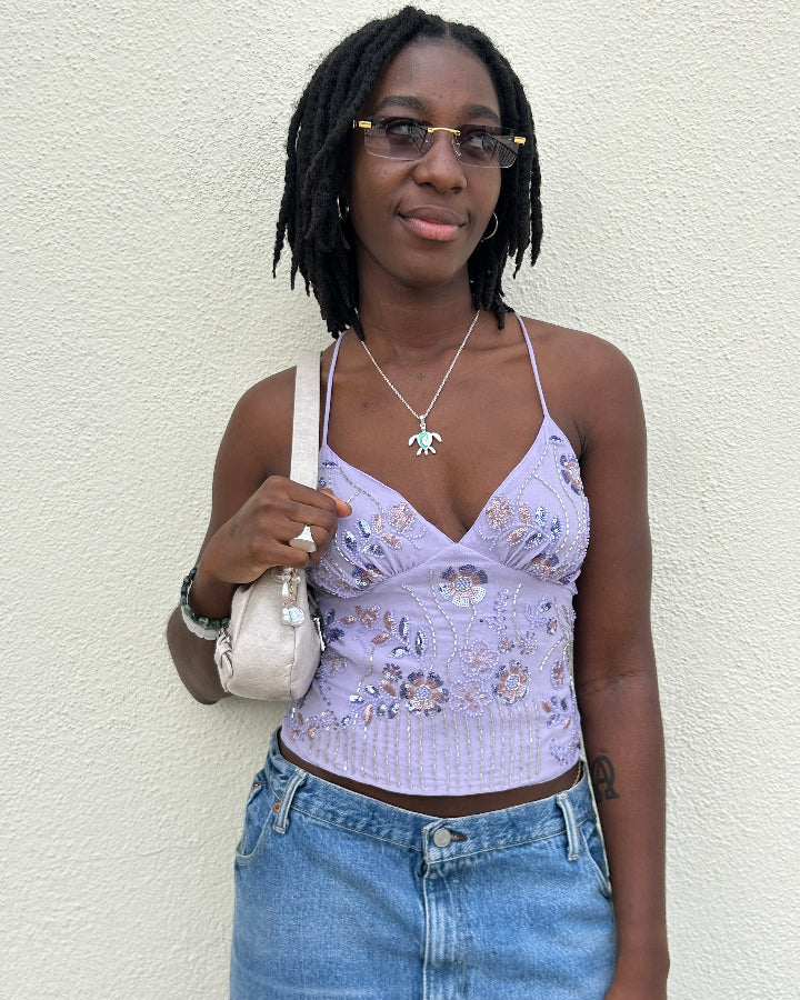 The Veda Beaded Backless Top features delicate floral beaded detailing on a sheer chiffon fabric. Designed with a plunging v-neckline, adjustable straps, and an open back with a lace-up tie. Lightweight with a soft lining for an easy, flattering fit.