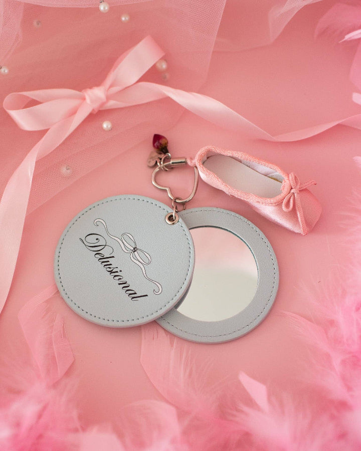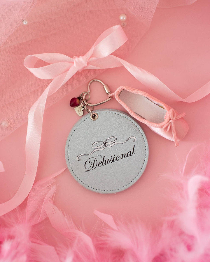 This one's for the delulu girlies 🎀 Find yourself needing a cute little mirror when you're on the go? Add this adorable mirror keychain to your keys, bag, etc and always stay looking your best. Featuring a cute bow print with the word, "delusional" on the front, simply open the flap to reveal a little mirror. The carabiner on this keychain is a silver heart shape with a ballet slipper, rosebud, and heart charm included! Mirror is made of leatherette. Measures 3" x 3"