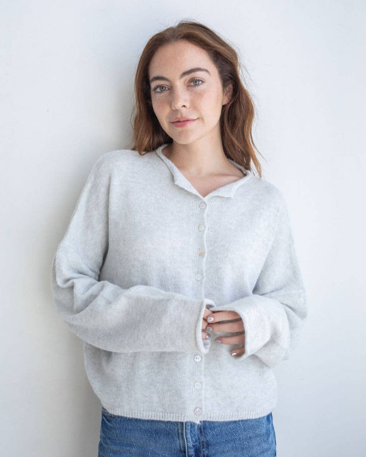 Soft and cozy lightweight cardigan with rolled edge finish on the sleeves and collar.