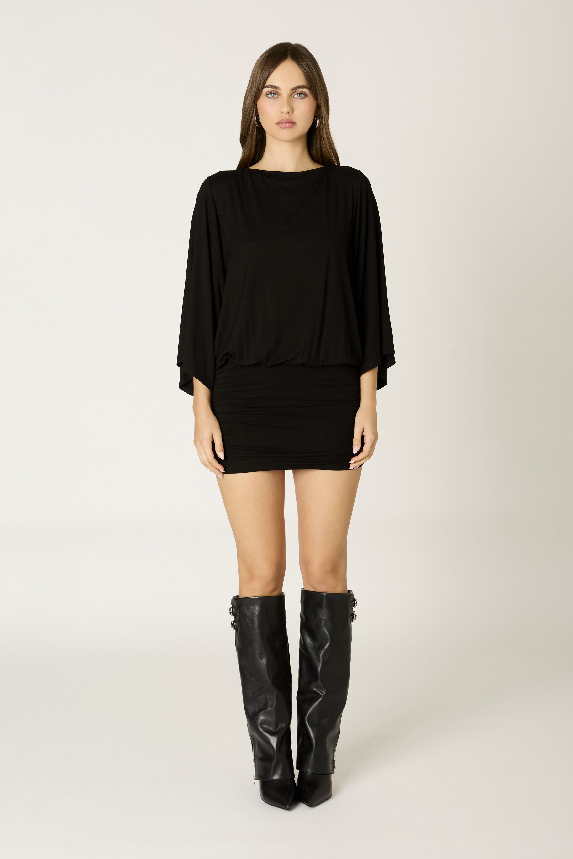 This stretch mini dress features a loose top with wide sleeves, a fitted ruched skirt, and an open back with a tie detail.