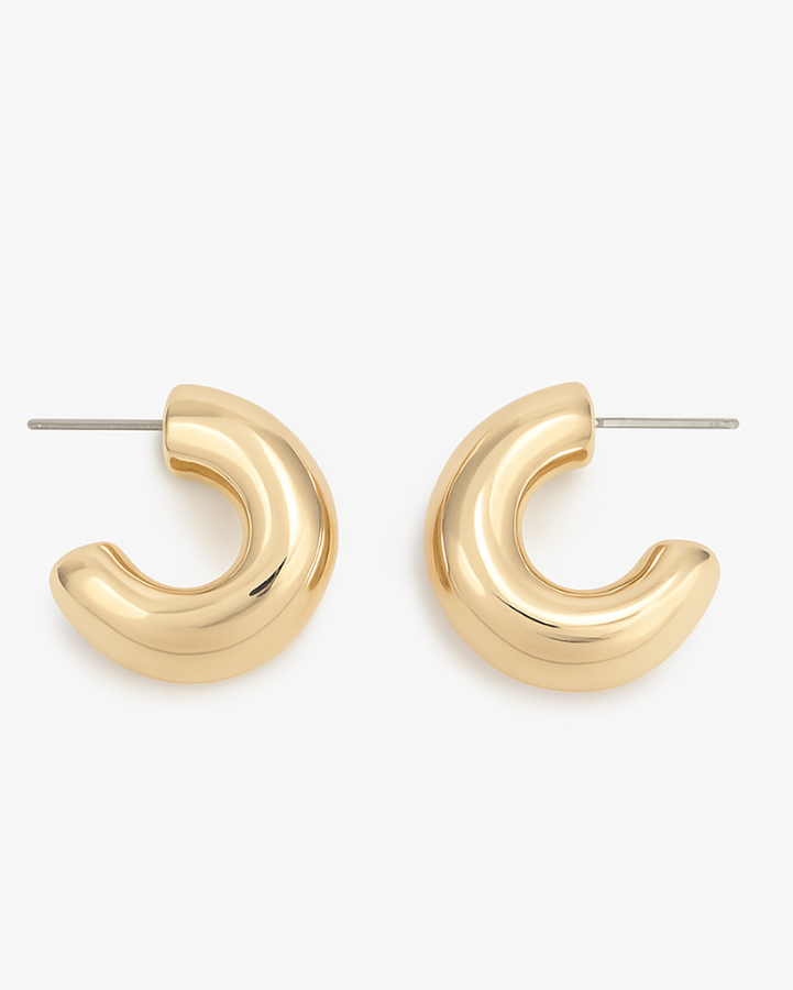 A pair of polished gold mini-hoops with a smooth, sculptural shape. Simple, shiny, and easy to wear — the perfect everyday earrings with a little modern lift.