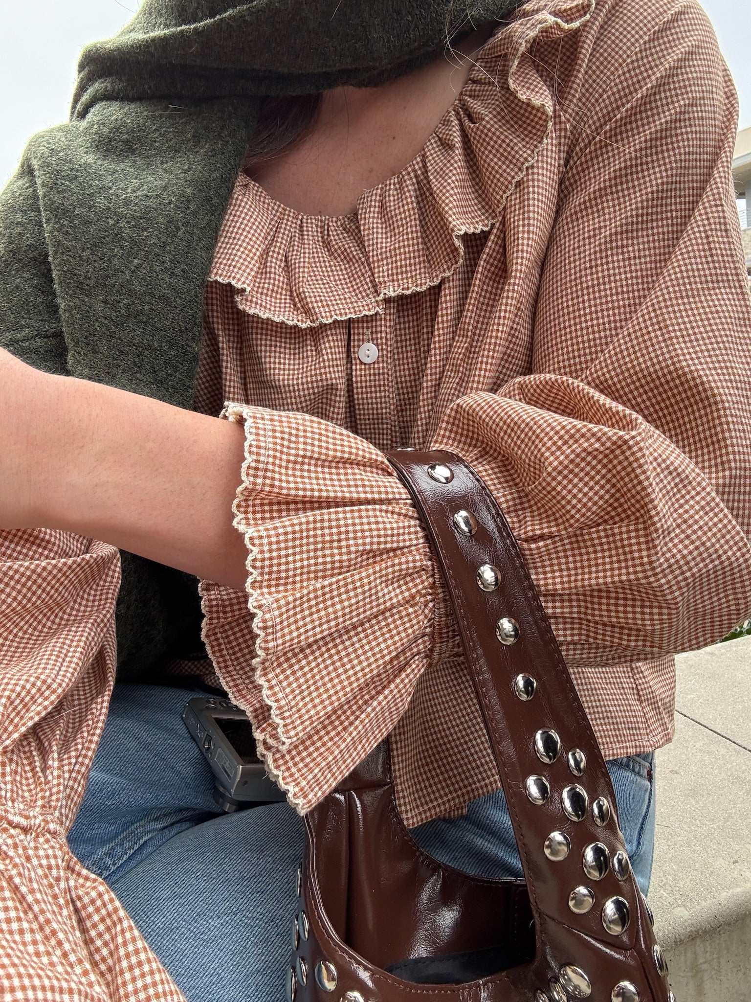 Meet your new wear-everywhere top: a soft gingham blouse with beautifully gathered sleeves, subtle ruffle edges, and an easy, slightly swingy fit. It’s polished enough for work, playful enough for the weekend, and made for layering—just add denim and your favorite knit tossed over your shoulders.
