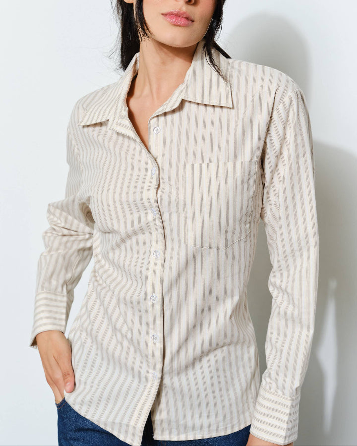 Upgrade your style with the Vera Button Up Shirt! This timeless piece features crisp striped fabric, a classic collared neckline, and a front button closure for that polished look. Long sleeves with cuffs add sophistication, while the self tie at the back lets you cinch the waist for a flattering, feminine silhouette. Perfect for work, weekends, or anytime you want to look effortlessly put together.