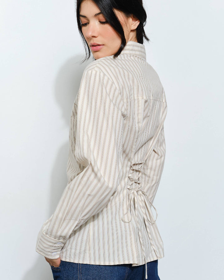 Keywords: striped button up shirt, collared shirt, long sleeve blouse, self tie back shirt, classic women's top, trendy women's fashion, wholesale women's clothing, versatile button up, chic cotton shirt