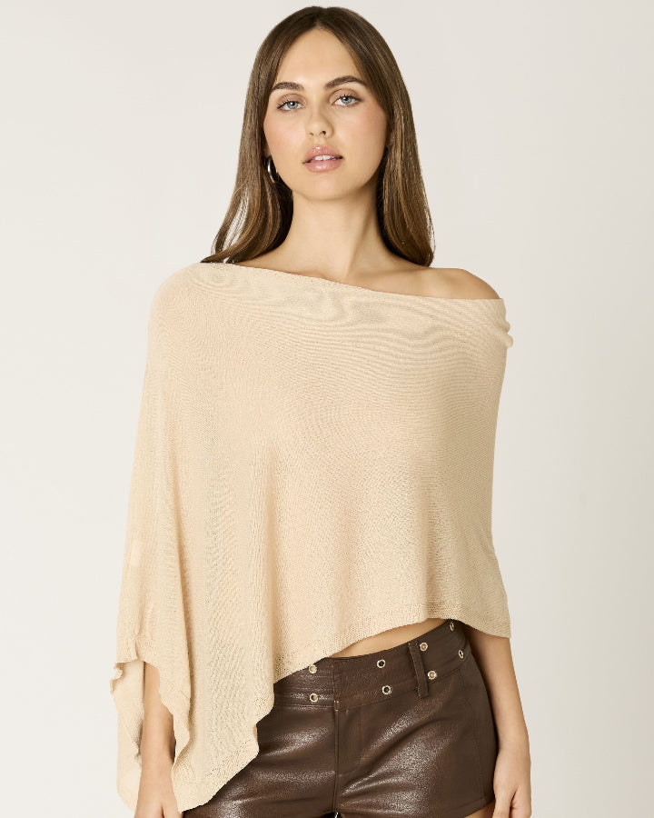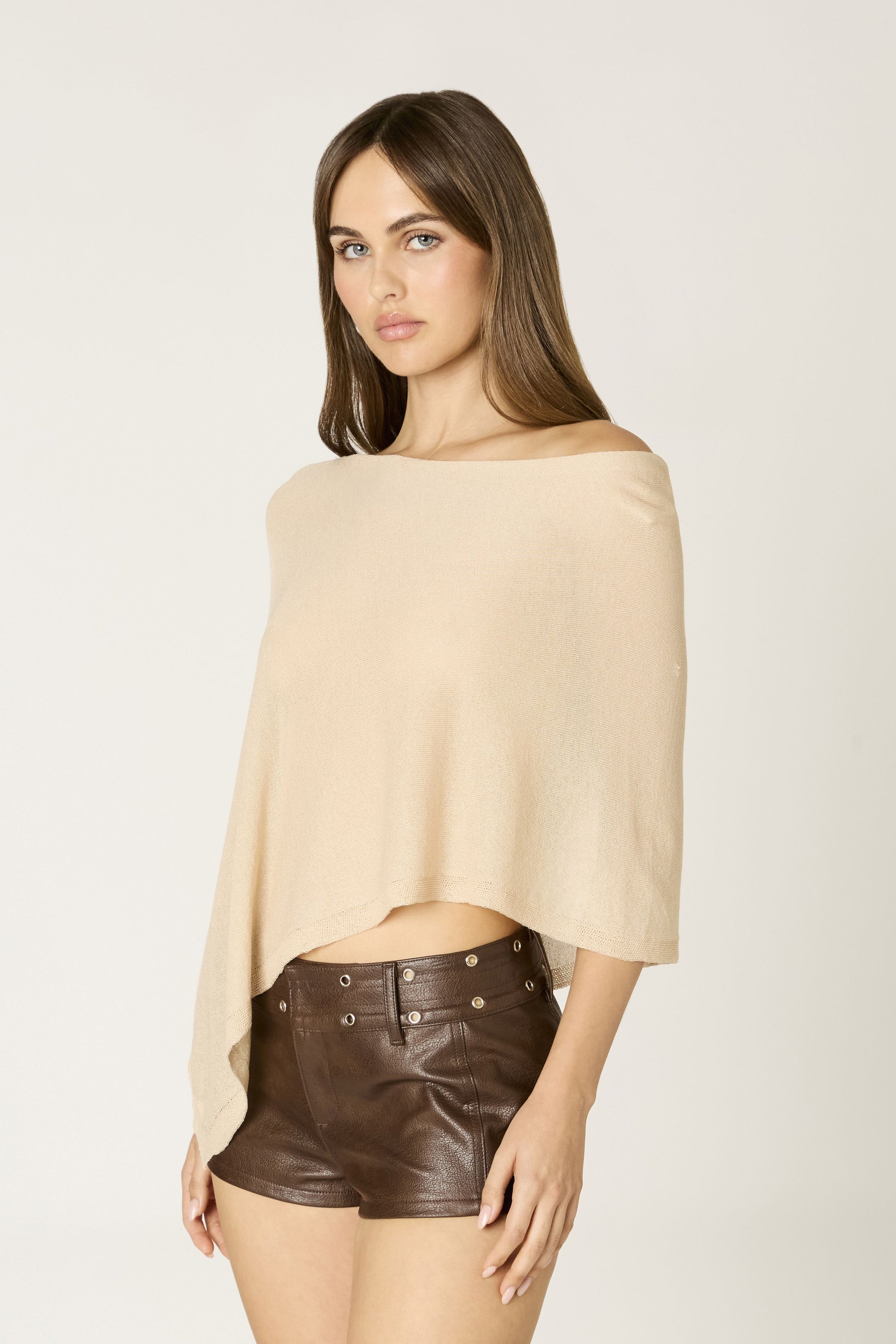 This lightweight knit sweater top features a relaxed asymmetrical hem with an off-the-shoulder neckline and a semi-sheer finish.
