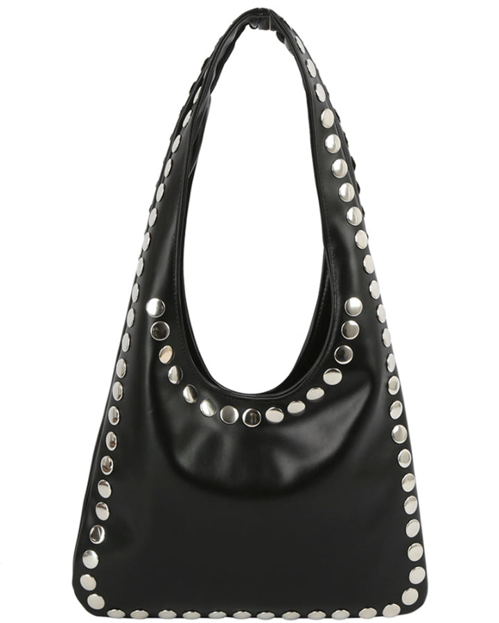 A sleek black shoulder bag with bold silver studs and a soft, slouchy shape. Easy to wear and effortlessly cool.
