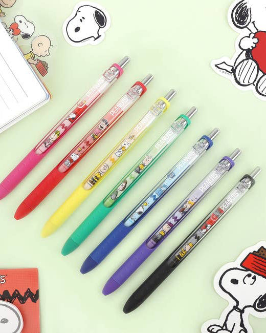 These are Peanuts Character Gel Ink Pens available in 7 vibrant designs, each featuring beloved characters like Snoopy, Charlie Brown, and friends. The pens come with a 0.5mm fine tip, perfect for smooth and precise writing. With black gel ink, they are ideal for everyday use, whether for notes, journaling, or creative writing. Each design option adds a playful and nostalgic charm to your stationery collection. Size:11x146mm