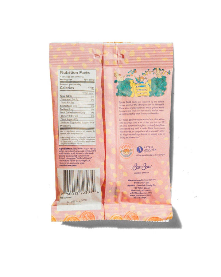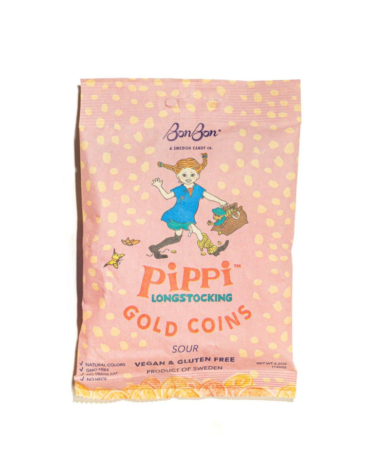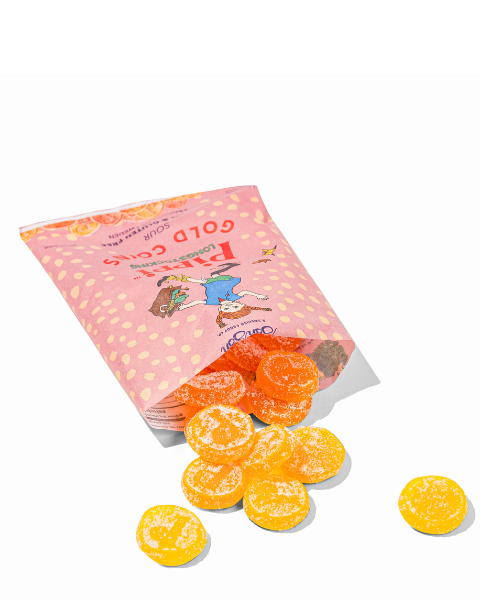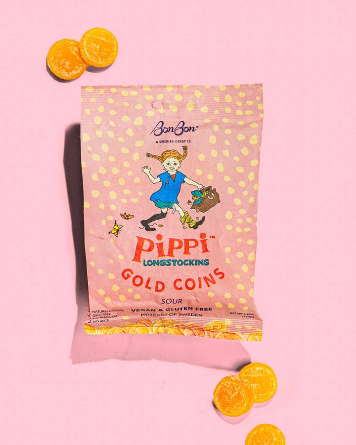 Inspired by the adventurous Pippi Longstocking, these Gold Coins are a treasure of tropical flavors! Each coin is a soft, chewy delight, bursting with pineapple and peach-apricot flavors, finished with a tangy sour coating. It’s a sweet and sour adventure in every bite!