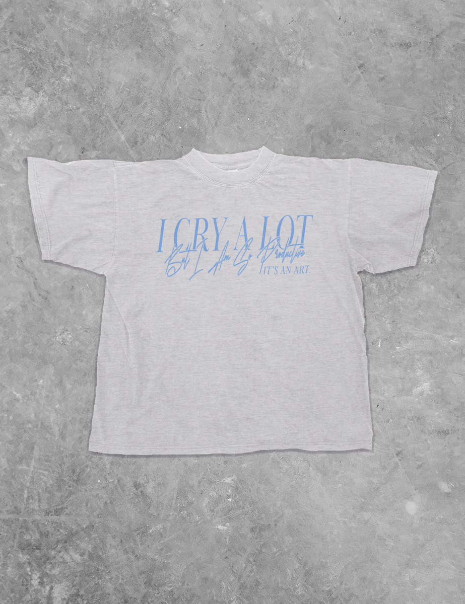 - Features "I Cry A Lot But I Am So Productive, It's An Art" across the front all in a light blue ink
