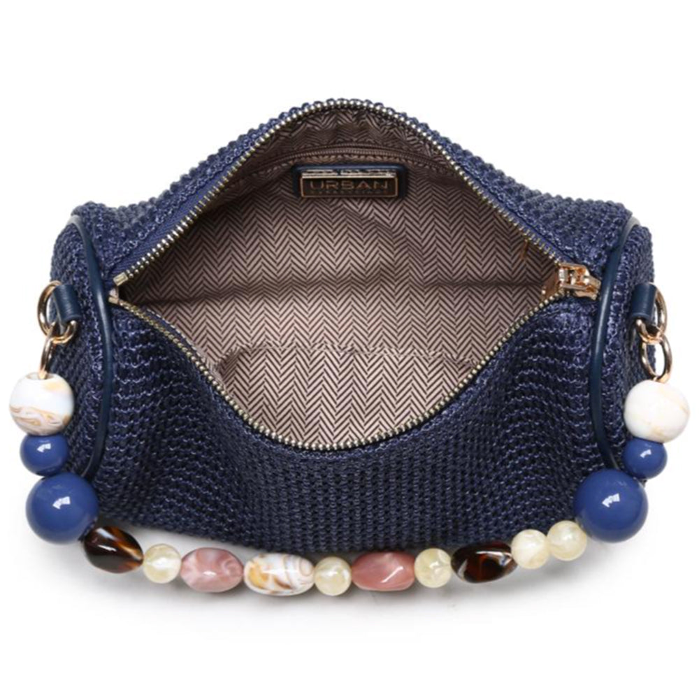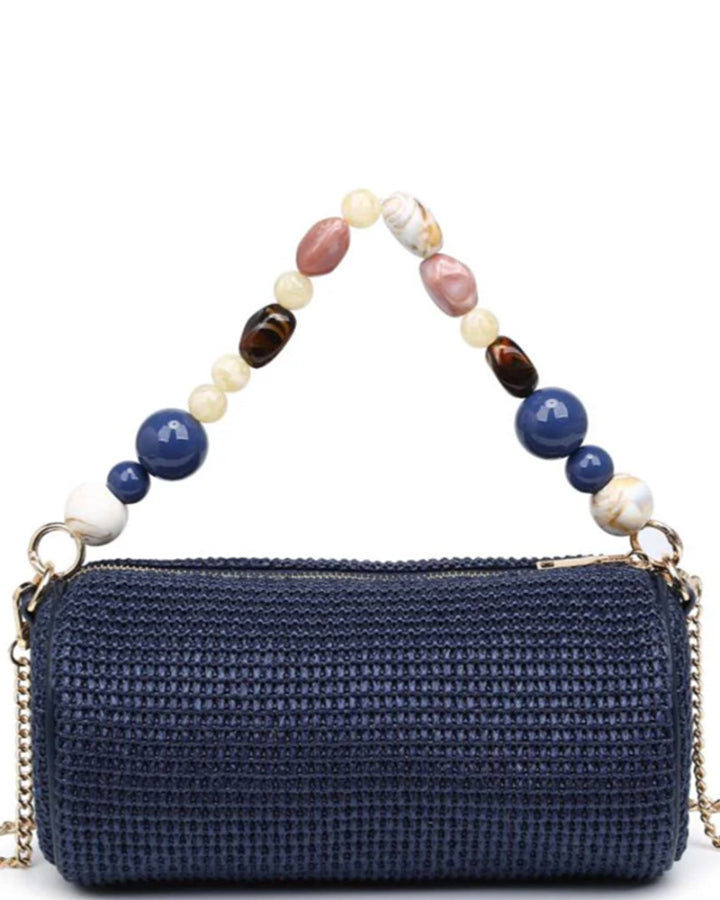 Woven cylindrical body adds structure and texture; metal rings secure the beaded top handle for hand carry, with a gold-tone chain shoulder strap for over-the-shoulder use.