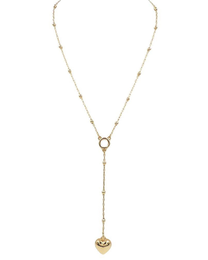 Featuring a puffy, dimensional heart pendant that dangles from a long Y-shaped chain, this playful piece brings instant charm and whimsy to your everyday look.