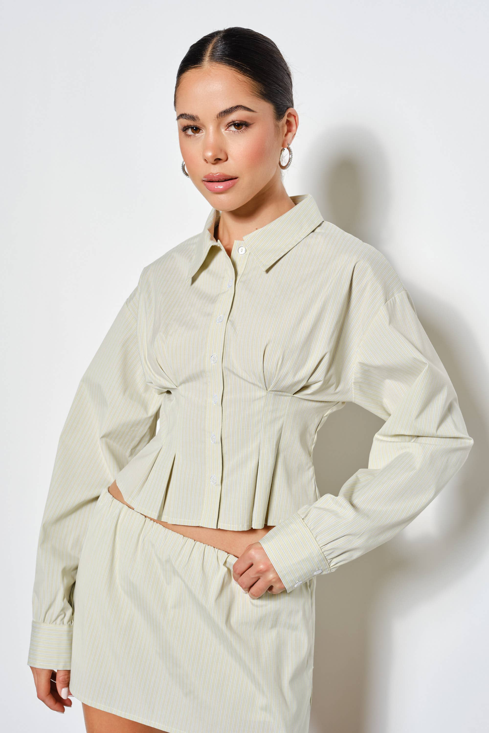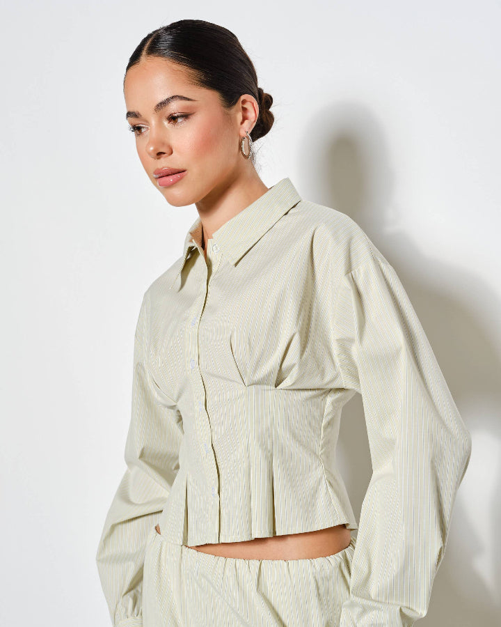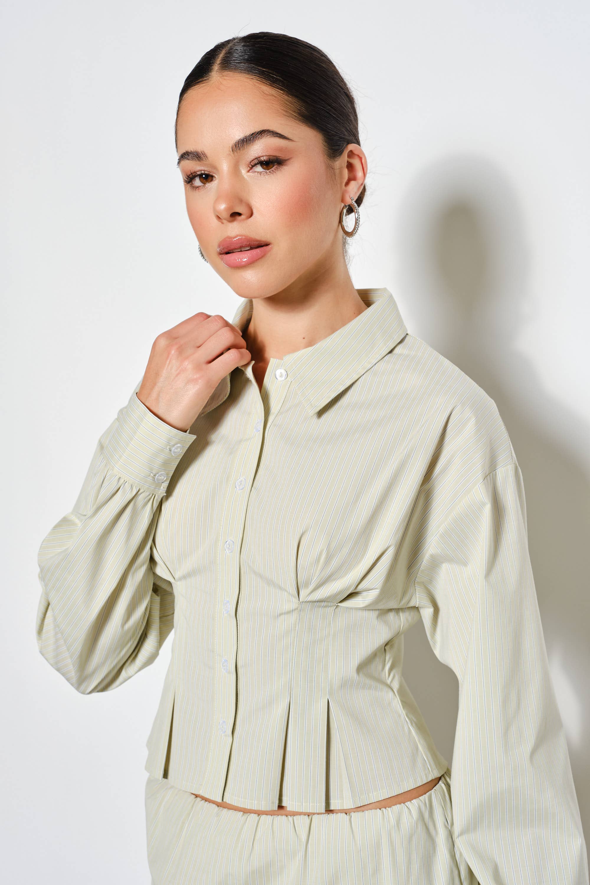 The Cheyenne Pleated Shirt blends timeless tailoring with a soft, feminine twist. Crafted from lightweight striped fabric, it features a crisp collared neckline, front button closure, and long sleeves for a polished look. The peplum-inspired pleated detail adds a touch of structure and movement, making it effortlessly chic and flattering.
