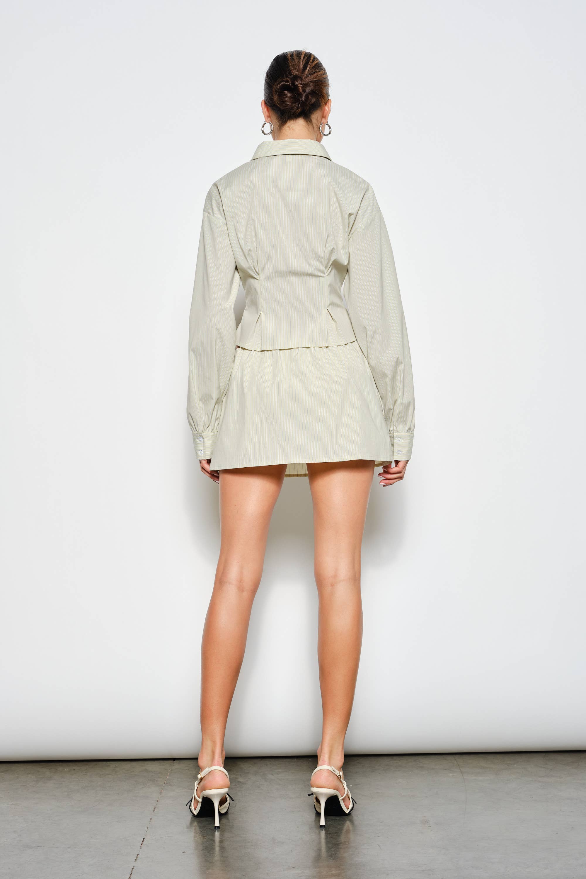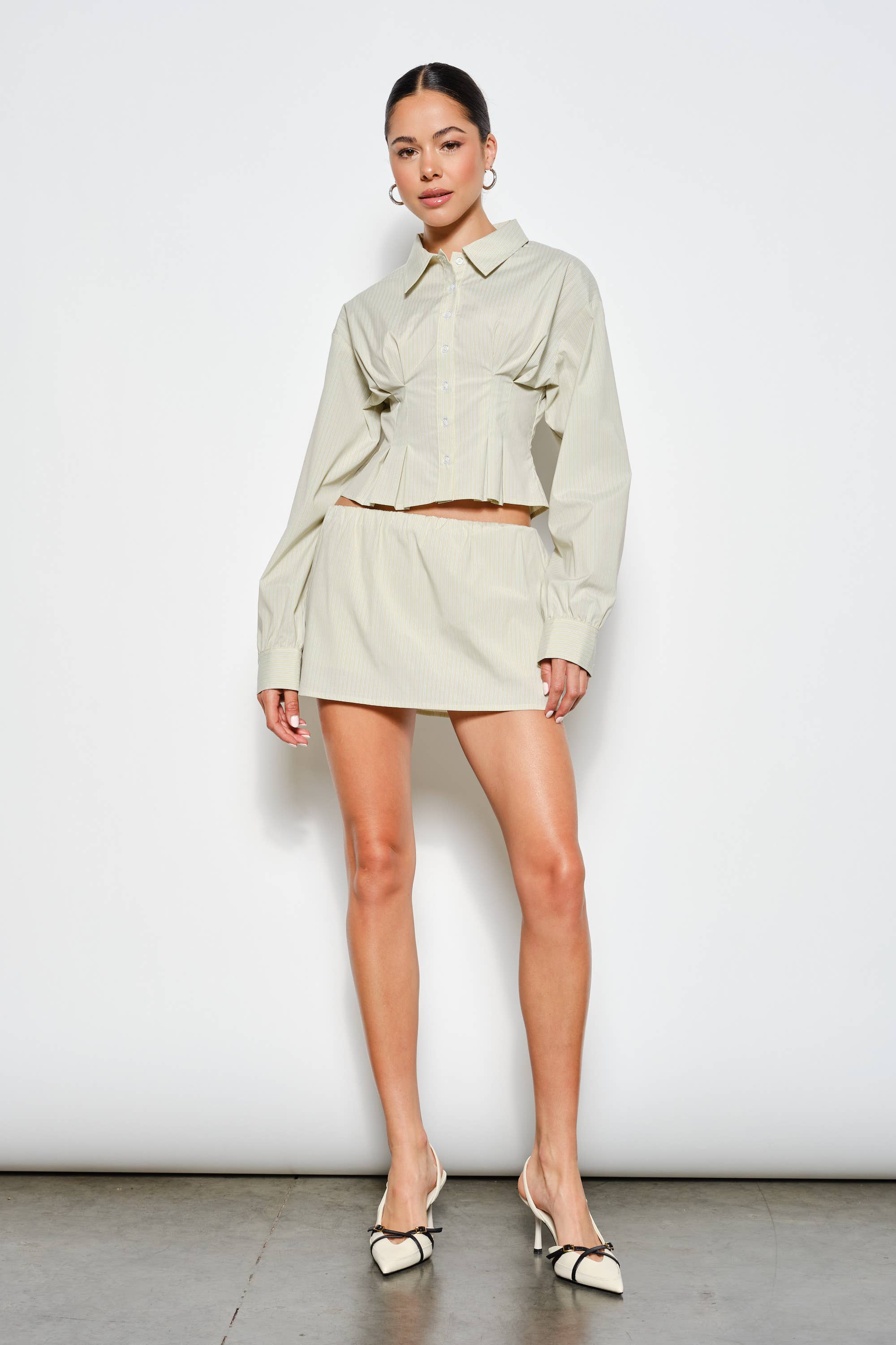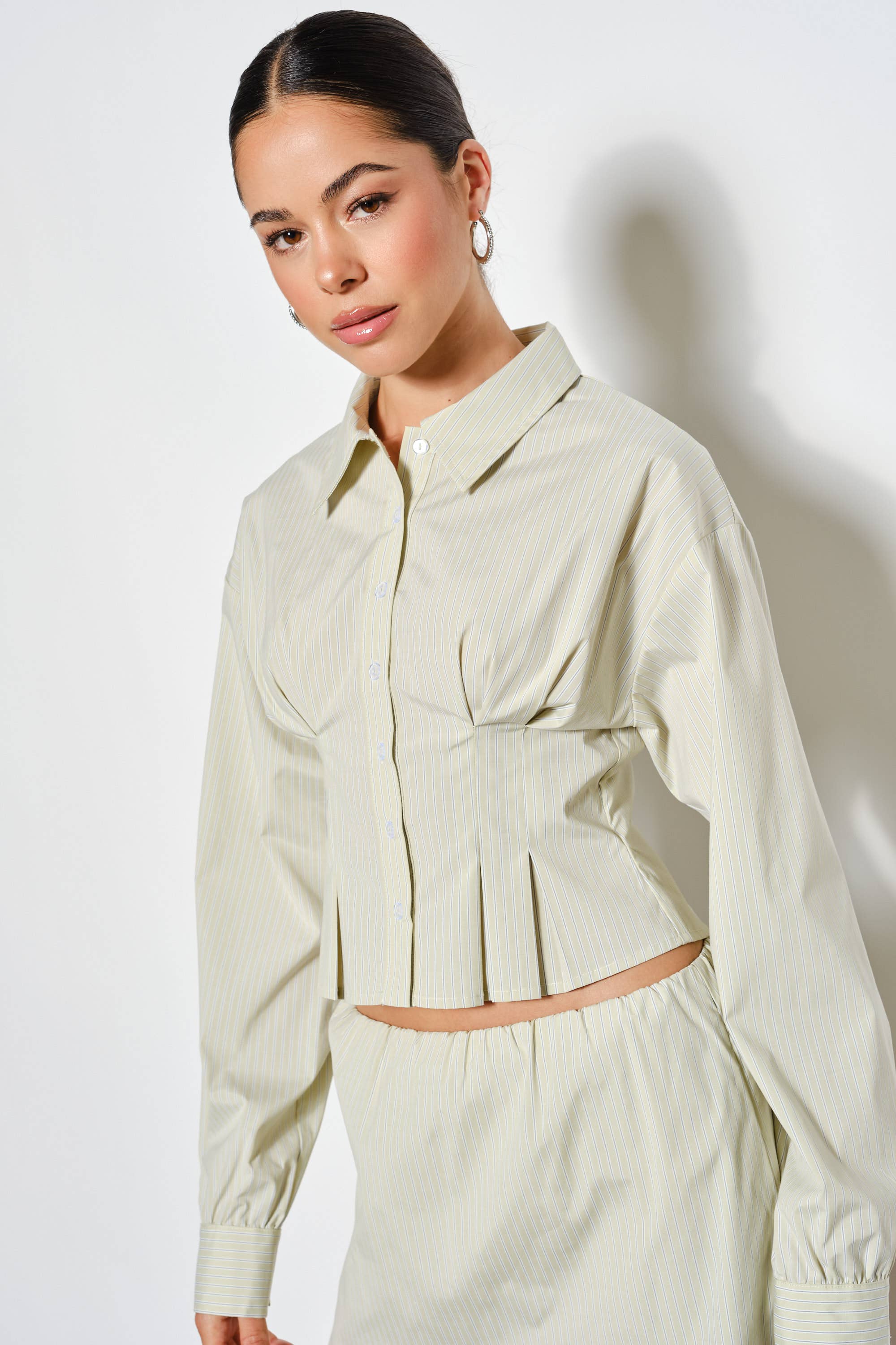 The Cheyenne Pleated Shirt blends timeless tailoring with a soft, feminine twist. Crafted from lightweight striped fabric, it features a crisp collared neckline, front button closure, and long sleeves for a polished look. The peplum-inspired pleated detail adds a touch of structure and movement, making it effortlessly chic and flattering.