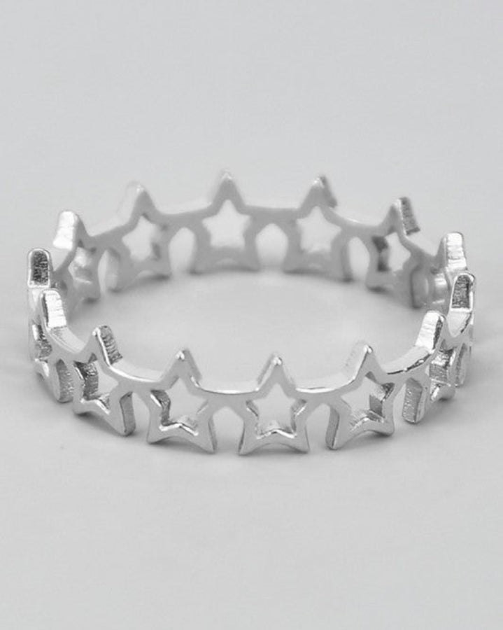 Shine bright with this cutout star link ring in size 7. Featuring interlocking star shapes with open cutout details, it offers a modern yet playful design. Lightweight and comfortable for daily wear, this piece adds a touch of celestial charm to any jewelry collection.