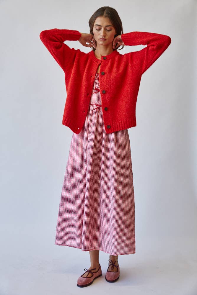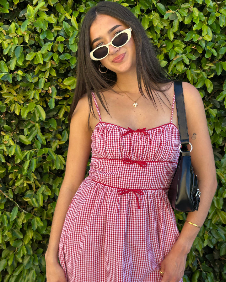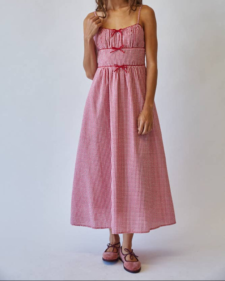 A charming long dress in red gingham with delicate ribbon accents. Fabric & Fit Crafted from a lightweight cotton-blend fabric with natural breath-ability, this dress is perfect for warm days. The fitted bodice with smocking at the back ensures comfort, while the flared skirt flows effortlessly to create a flattering silhouette.