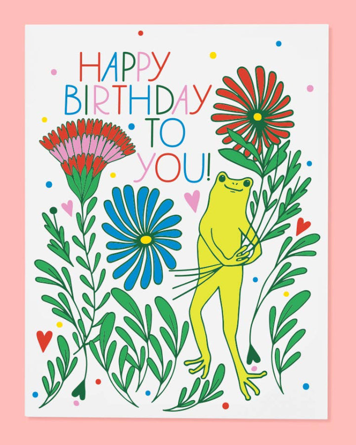 A birthday greeting from a froggy friend! - size A2, 4.25 inches by 5.5 inches folded - offset printed on bright white paper - packed in a cello sleeve with corresponding envelope (color may vary) - blank inside, ready for your own special message! - printed locally in California, assembled in our Los Angeles studio