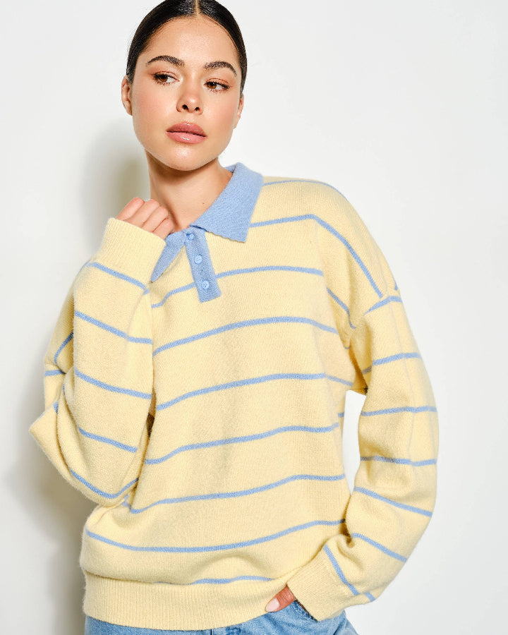 The Joanna Striped Rugby Sweater gives classic collegiate style a fresh, cozy update. This knit favorite features bold stripes, a crisp contrast collar, and a front button closure for that effortless sporty look. Designed with long sleeves and an oversized fit, it drapes beautifully for all-day comfort and a laid-back, relaxed vibe. Soft, plush, and easy to wear, this standout sweater blends timeless details with a modern, trend-forward touch that feels equal parts casual and cool. Model is 5'8" and wearing a size small. Fabric: 45% Acrylic, 29% Polyester, 26% Nylon