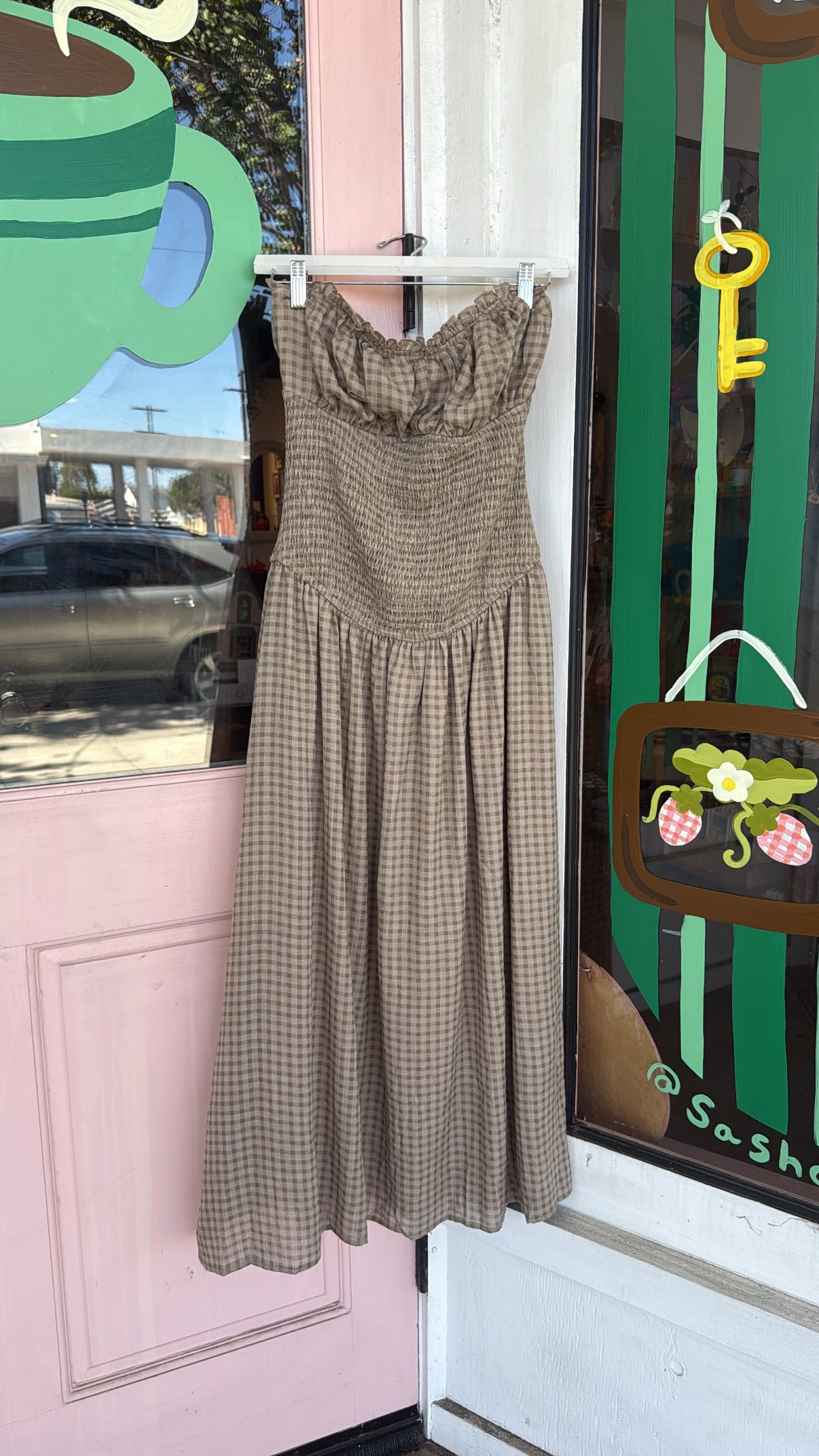 Our strapless gingham Heidi dress! Detailed with a drop waist and smocked waist