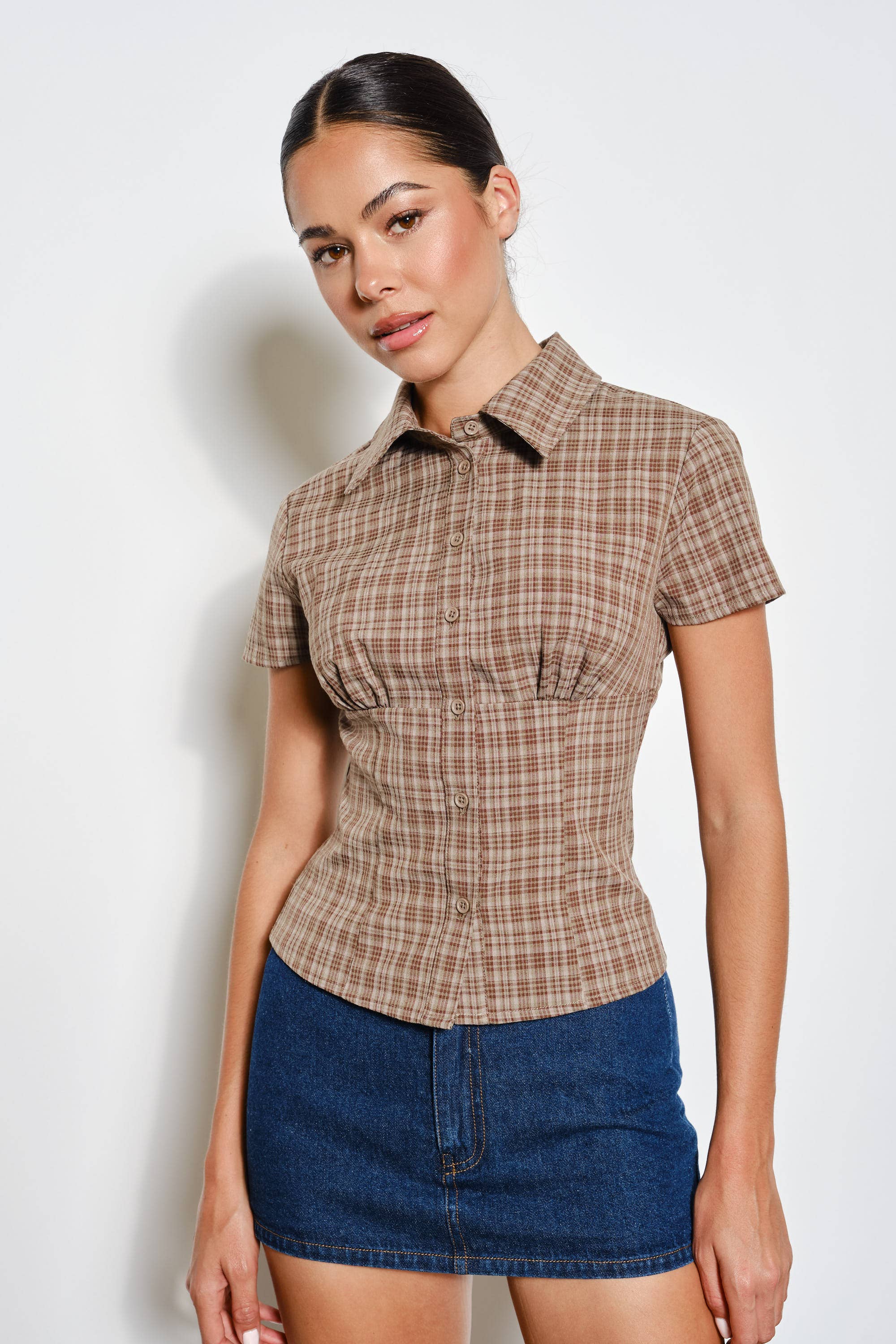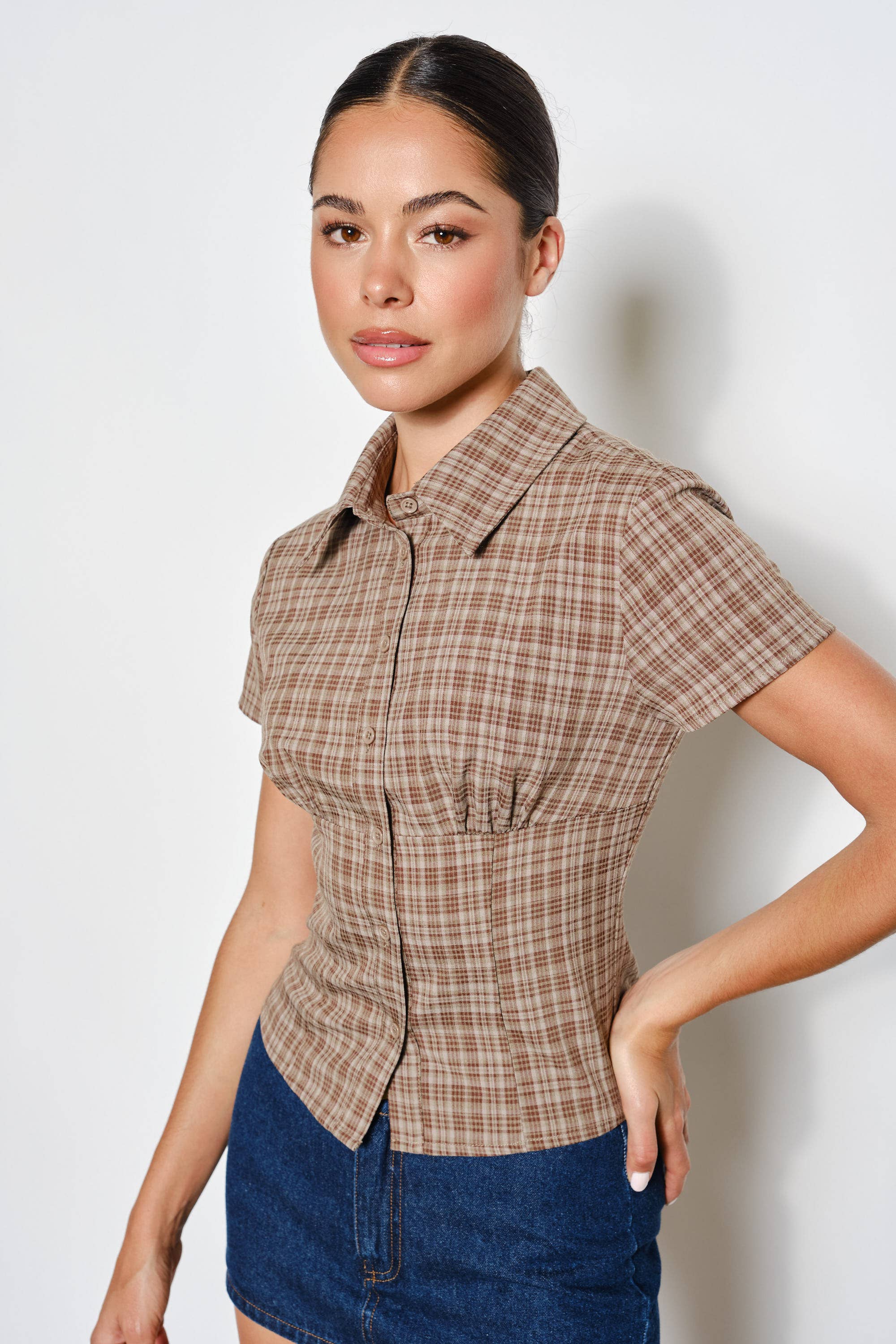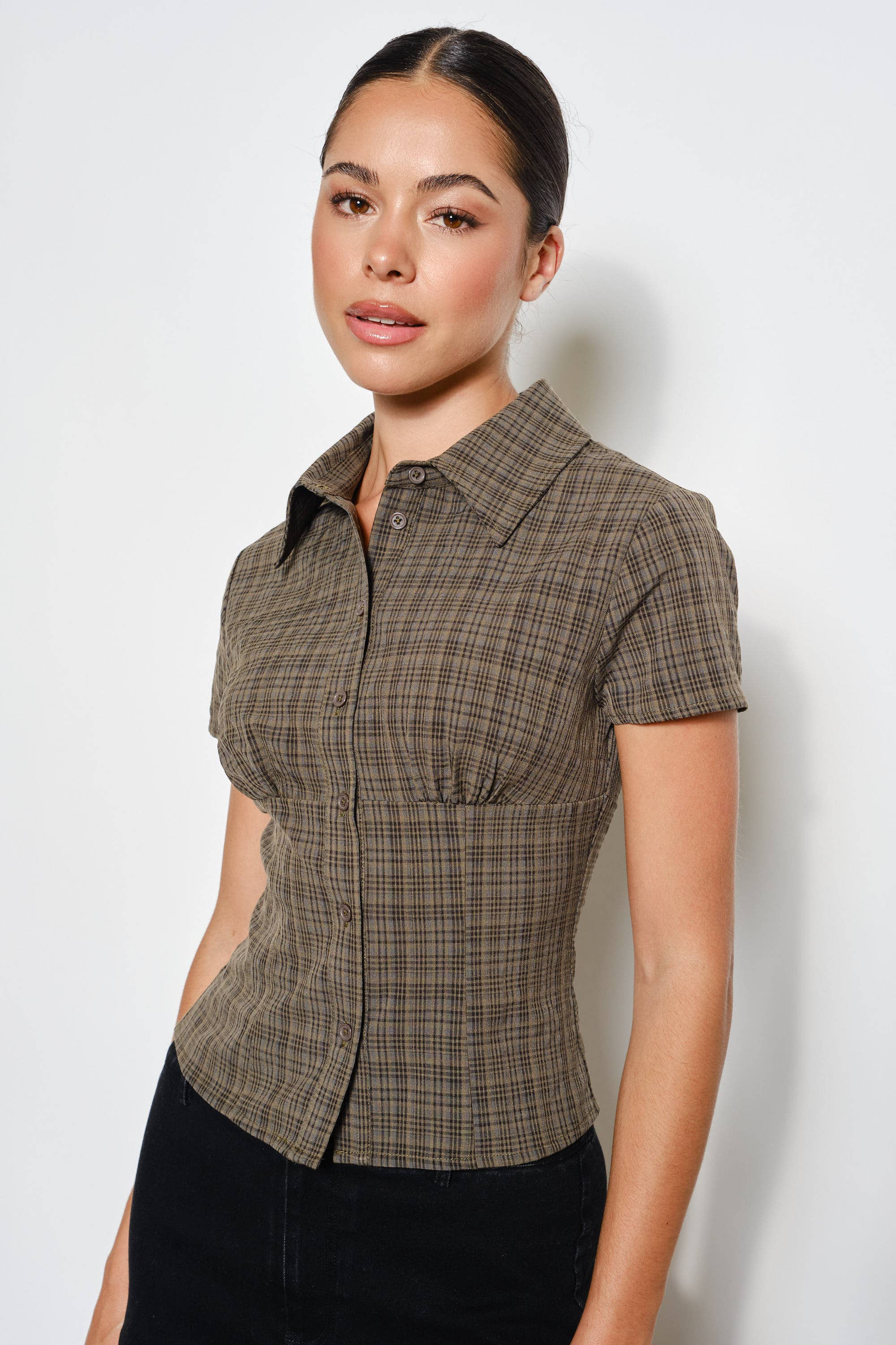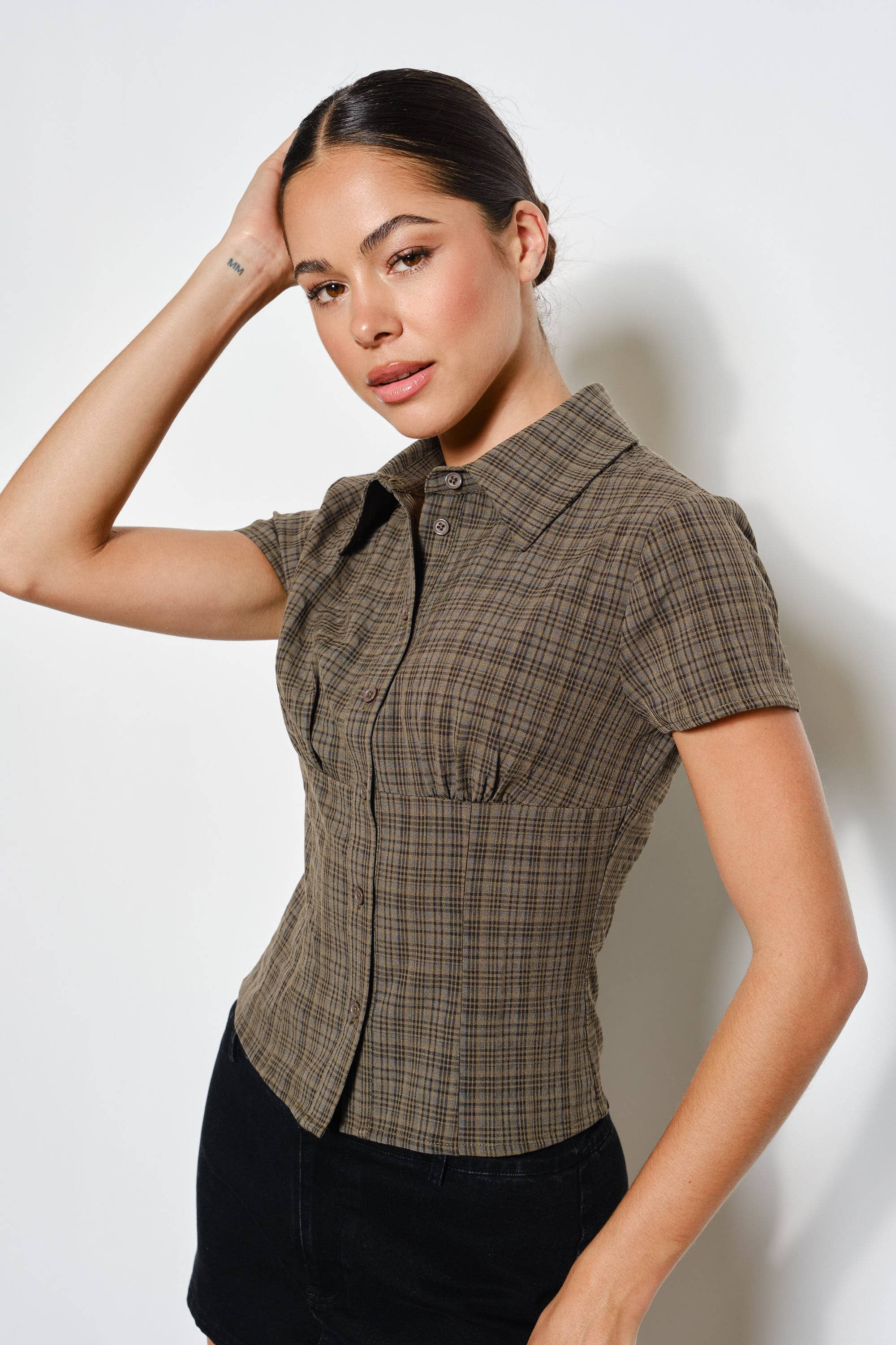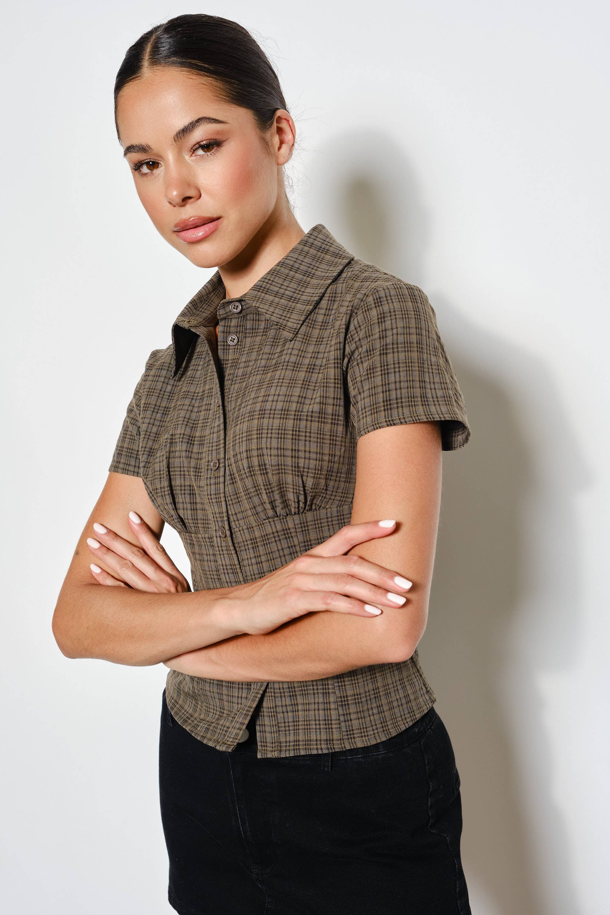 Keywords: plaid button up top, short sleeve plaid shirt, collared plaid blouse, classic women's top, wholesale plaid shirts, casual button-up, versatile casual top, trendy plaid button down.