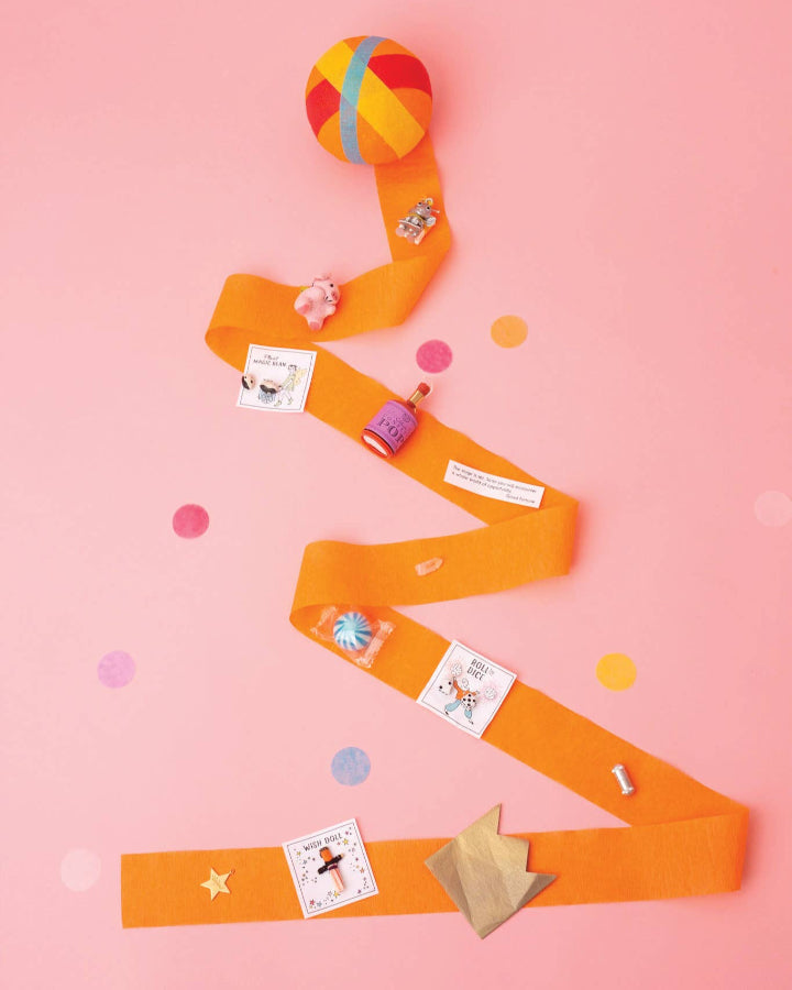 Unravel layers of colorful crepe paper ribbons to reveal a treasure trove of surprises tucked carefully within. These Surprise Balls are a nostalgic nod to the popular toy craze of the 1950s.