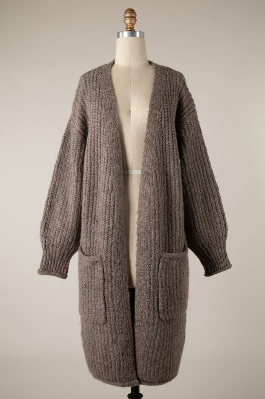 Chunky knit long cardigan with cozy pockets.