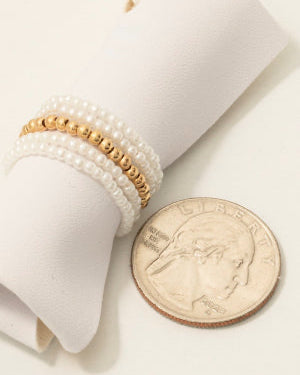 This ring set showcases a timeless pearl and metallic beaded elastic rings style. Experience a subtle blend of modernity and classic charm as this ring set effortlessly adorns your ensemble.