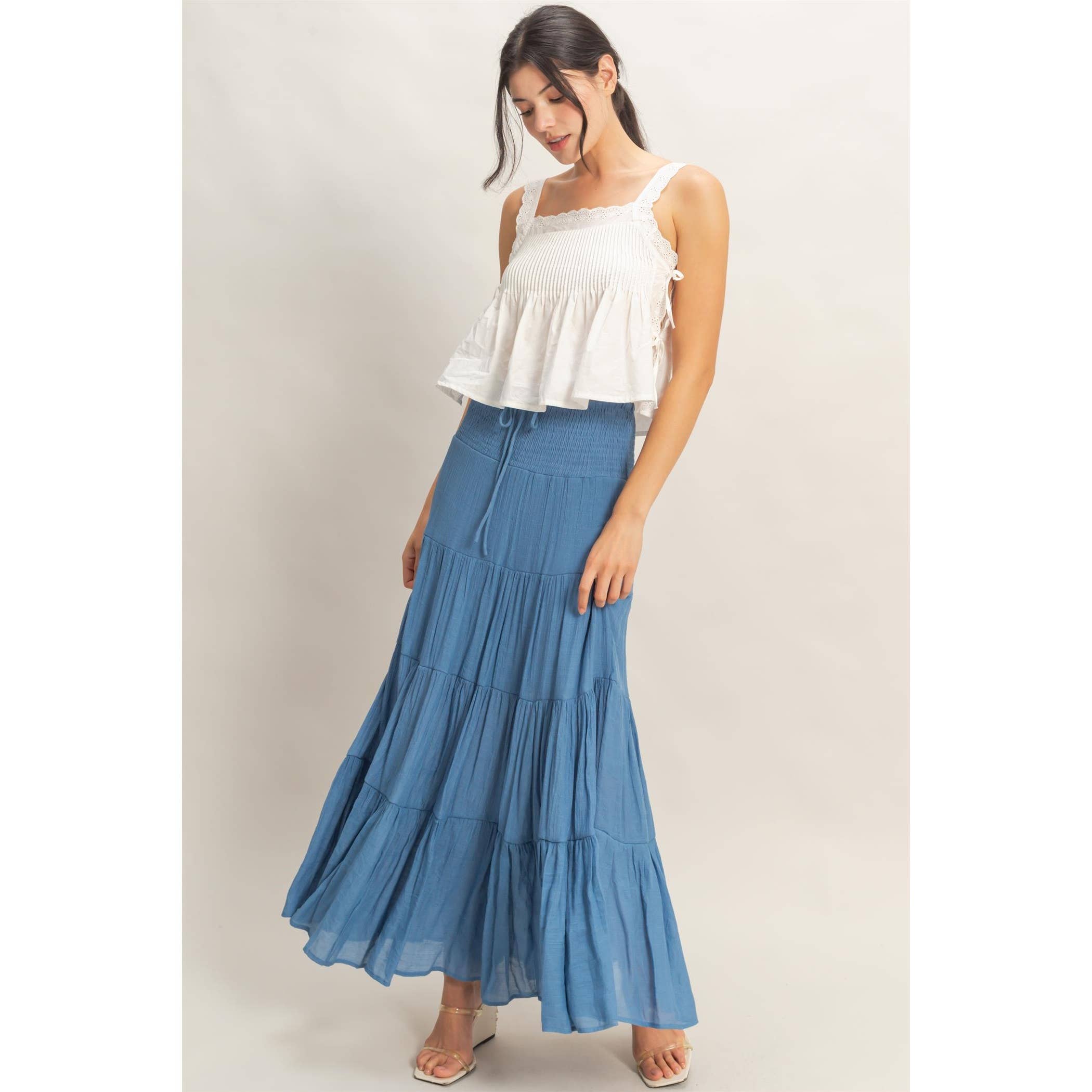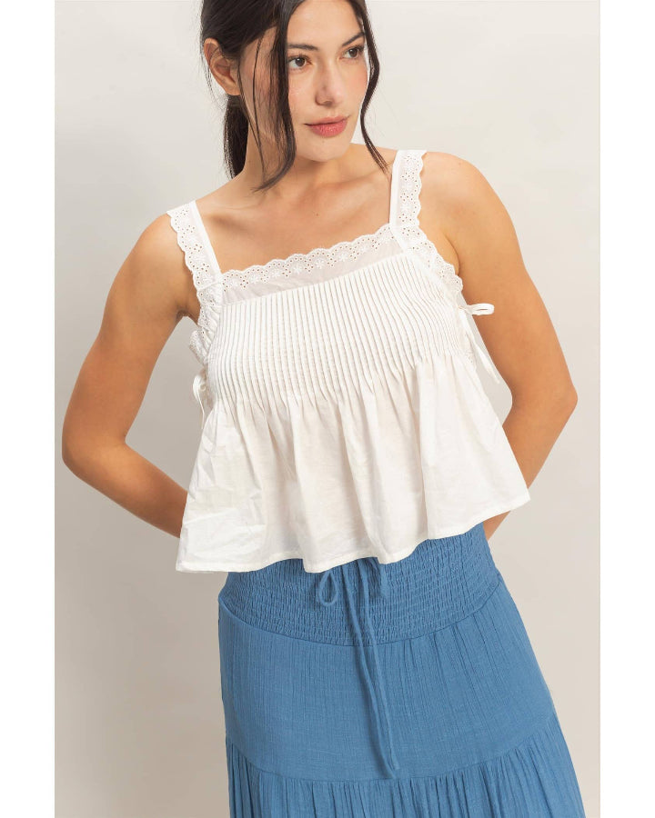 This tank features a pleated bodice with delicate lace trim, adding texture and charm. The flowing silhouette and subtle side ties create a breezy, effortless appeal. Its comfortable fit is perfect for layering over denim or pairing with a maxi skirt.