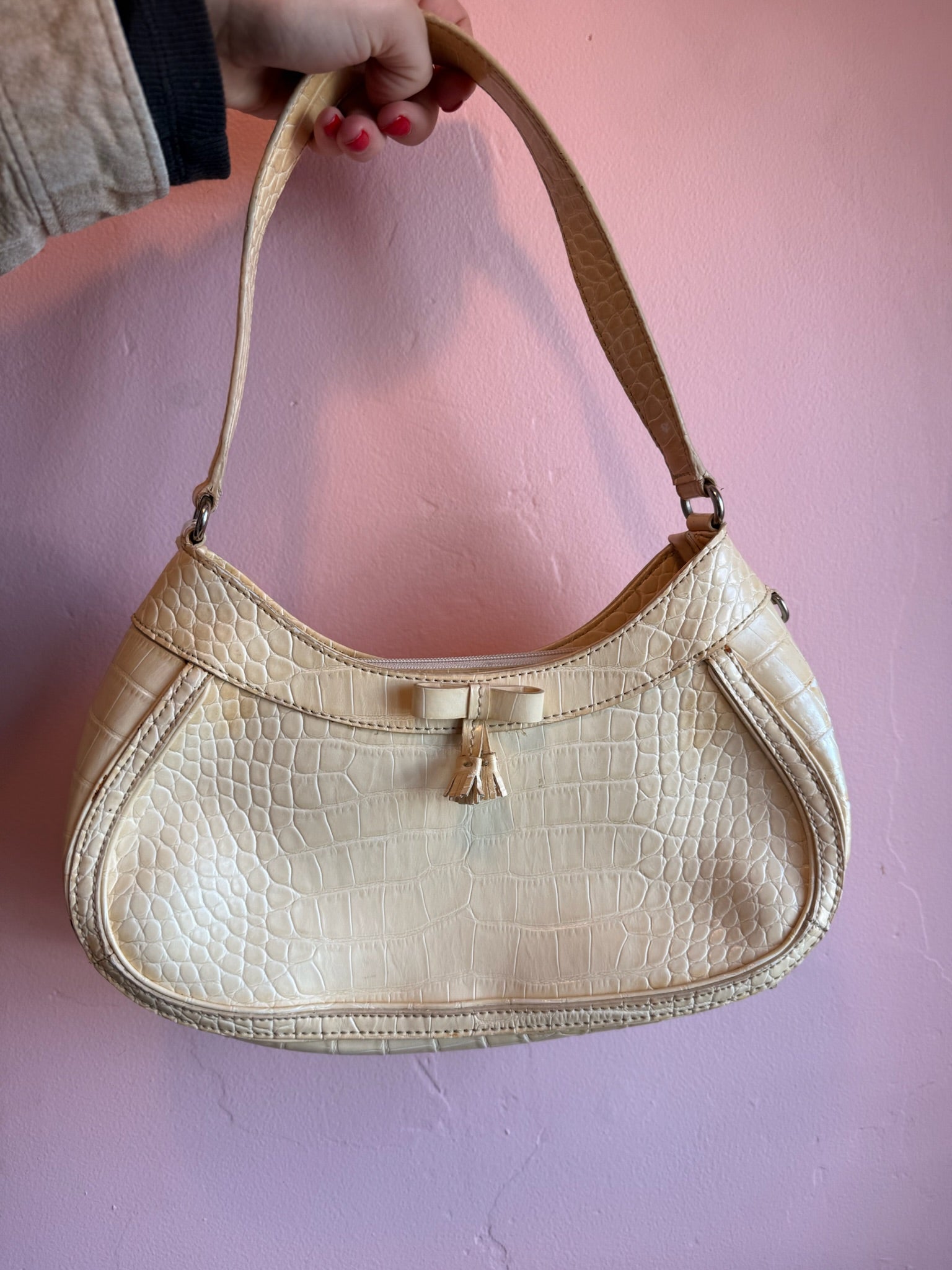 This is the perfect everyday bag for spring! It adds a nice pop of color and stands out with the alligator texture! There's little side pockets for you to store your little goodies!